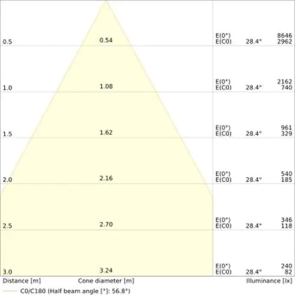 Der Abstrahlwinkel bezeichnet den Winkel, in dem das Licht aus der Lichtquelle ausgestrahlt wird. Er wird in Grad (D) angegeben. Je geringer die Gradzahl des Abstrahlwinkels ist, desto kleiner ist auch der Durchmesser des Lichtkegels, den die Lichtquelle produziert.